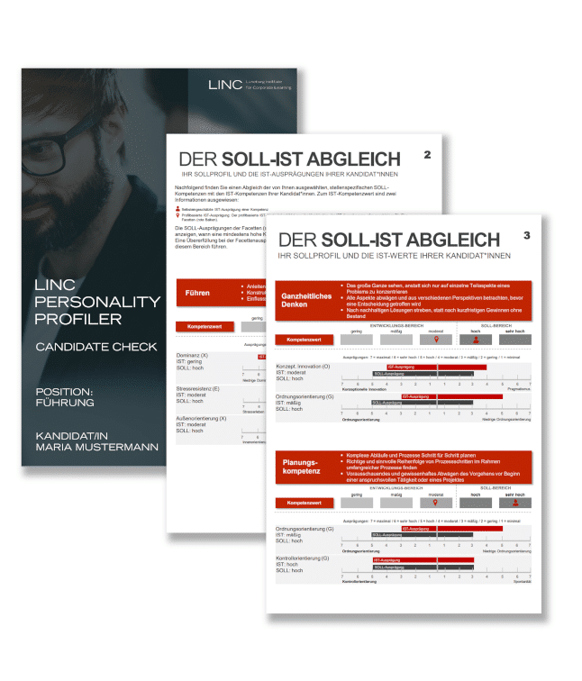 The LINC PERSONALITY PROFILER represents a new approach in the area of personality analysis and development. It is an online tool that is based on the most psychologically sound models and creates a very differentiated profile of character traits, motives and skills.